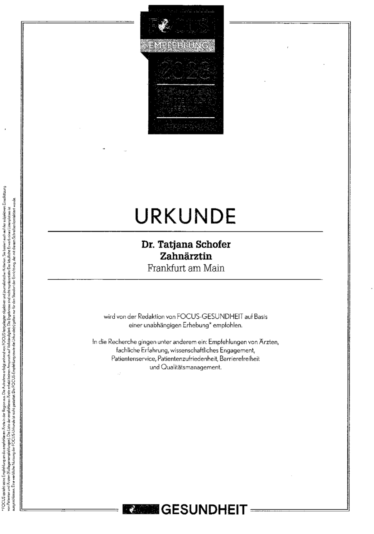 Под руководством Татьяны Шофер с более чем 30-летним опытом вас принимает слаженная, дружелюбная и международная команда специалистов, отличающихся высокой квалификацией, вниманием к деталям и индивидуальным подходом. Клиника расположена рядом со станцией Hauptwache; запись на приём возможна онлайн через платформу Doctolib (Доктолиб).